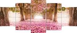Pembe Çiçekli Yol Beş Parçalı Kanvas Tablo